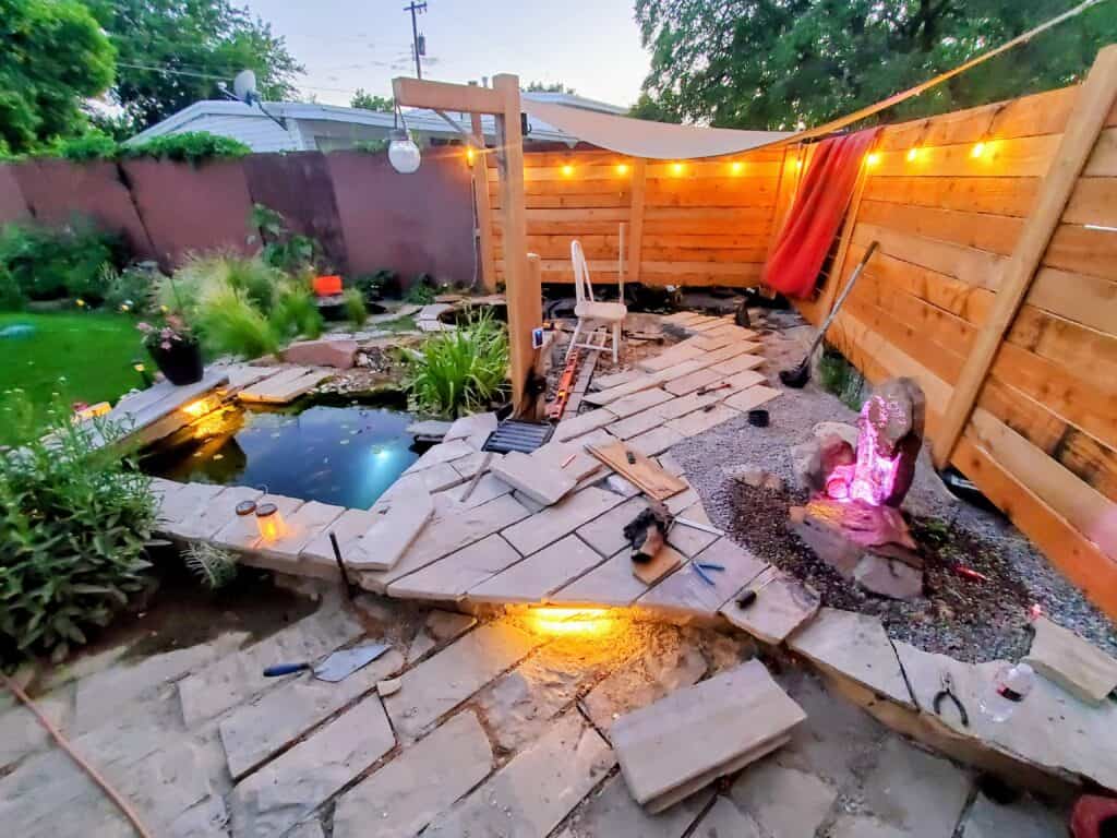 - The pond is lined with a mid-grade liner (I wish I had gone higher quality—lesson learned!)